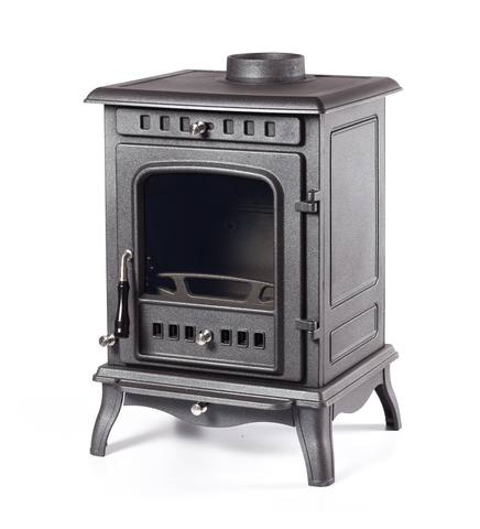 Moderne OEM gietijzeren houtkachel. met drie glazen zijden. Verwarming met binnenhaard.